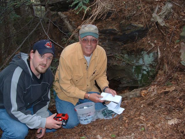 We went back to camp, ate lunch then departed for another cache. Up to the spot where "Pretty Boy Floyd" was gunned down by federal agents in 1934. Again, it was an uphill climb. After finding that one, Harold and Laurie went back to camp, Wil and Andy went to find the third cache and Tony hunted mushrooms while slowly wandering back to camp. No luck on the mushrooms that day, but great luck on the third cache.